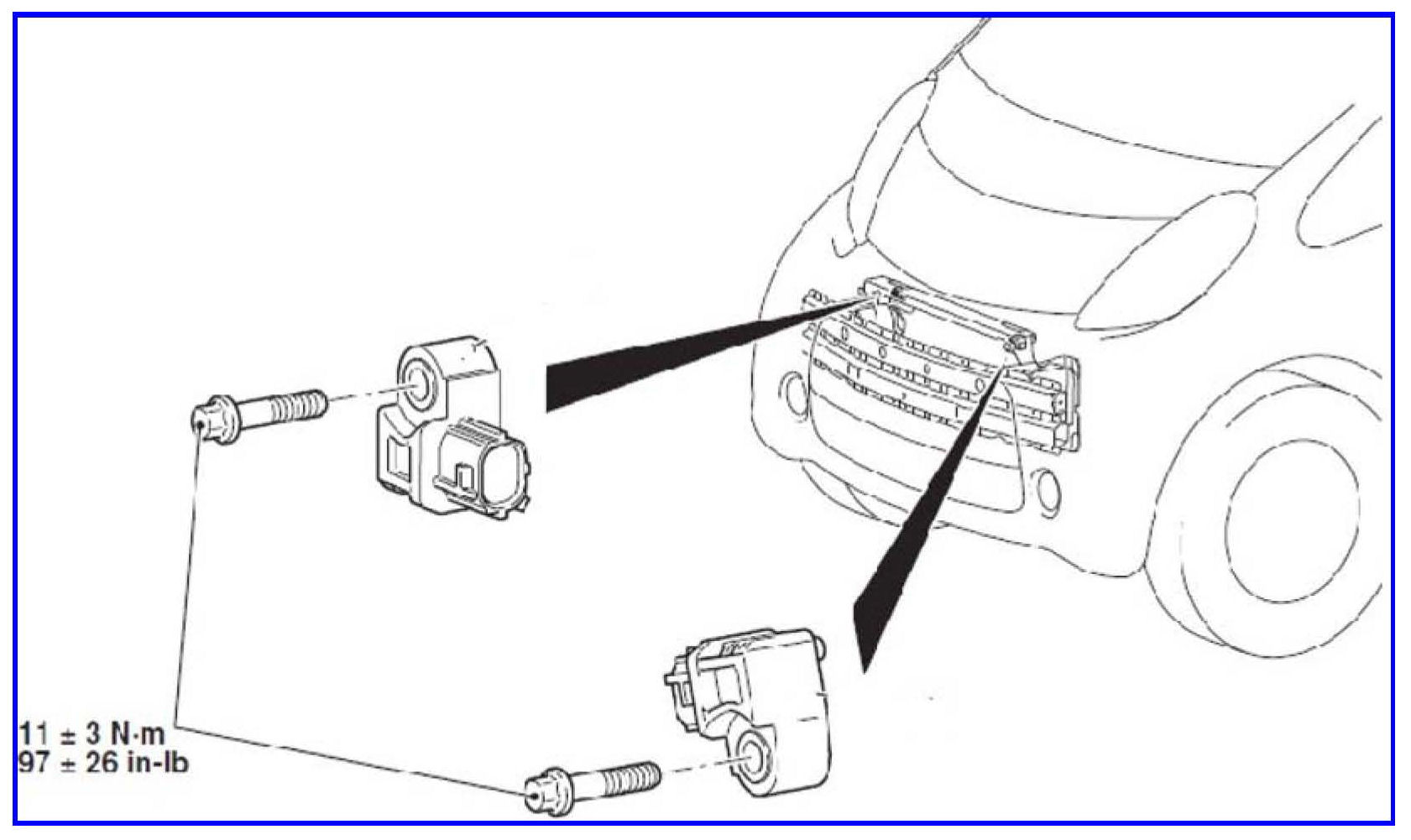 Use only hand tools when removing or installing front impact sensors. Torque to the proper specification to prevent damage (97 + 26 in-lb) (11+ 3 N-m).