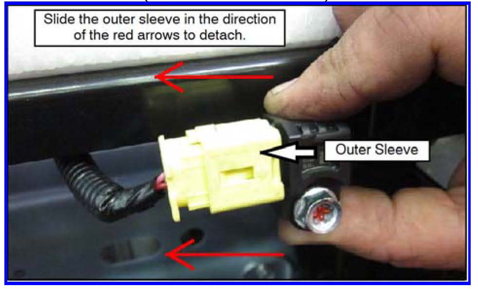 Slide the connector lock (outer sleeve) of the side impact sensor harness connector away from the sensor. Unlock and disconnect the connector.