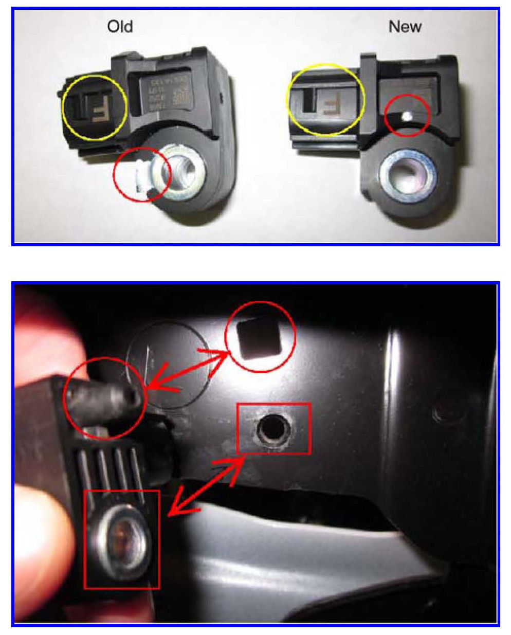distinguish the two, the torque mark on the old sensor is located near the hole. For new sensors, the mark is located near the part number (shown in Step 7).