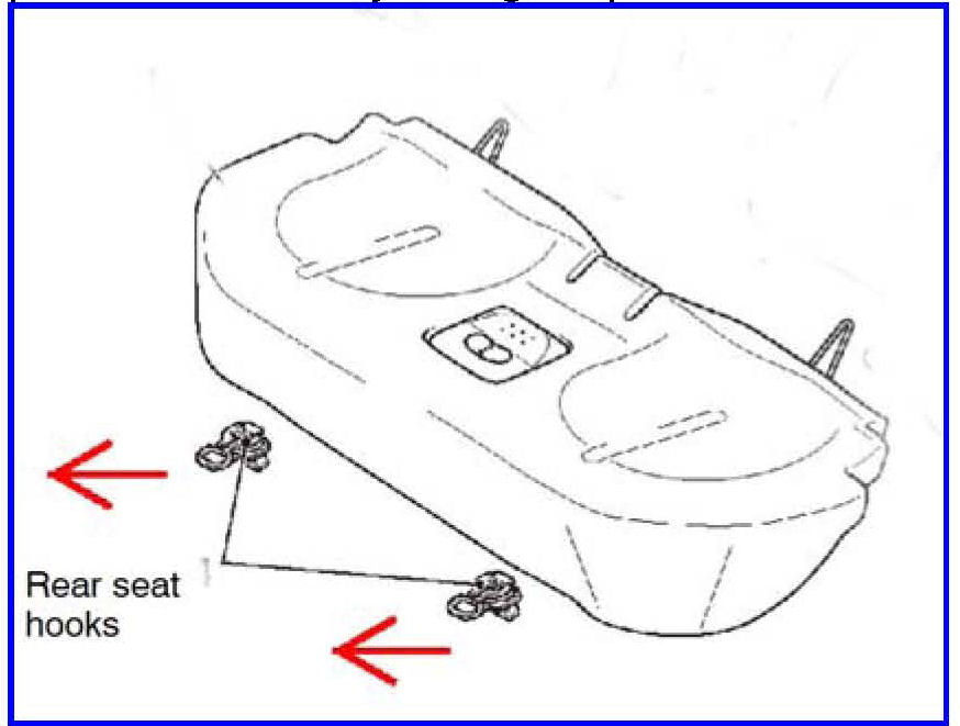 Pull the rear seat hook forward to unlock the rear seat cushion. Remove the rear seat cushion pad and cover by lifting it upward while simultaneously pulling the rear seat hook forward.