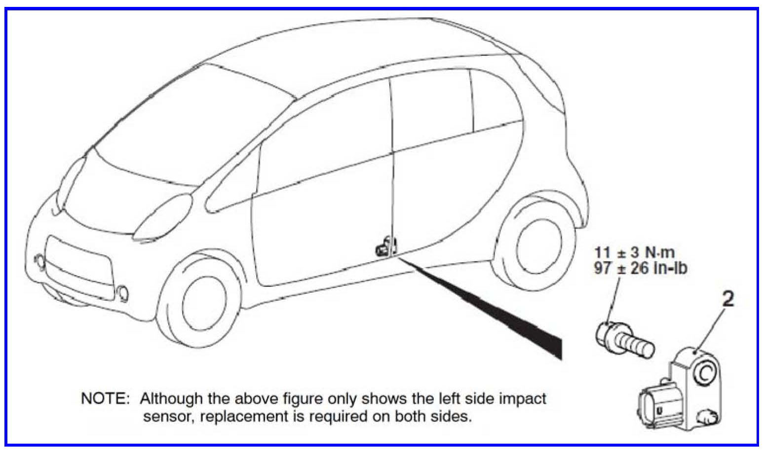 Use only hand tools when removing or installing side impact sensors. Torque to the proper specification to prevent damage (97 + 26 in-lb) (11+ 3 N-m).