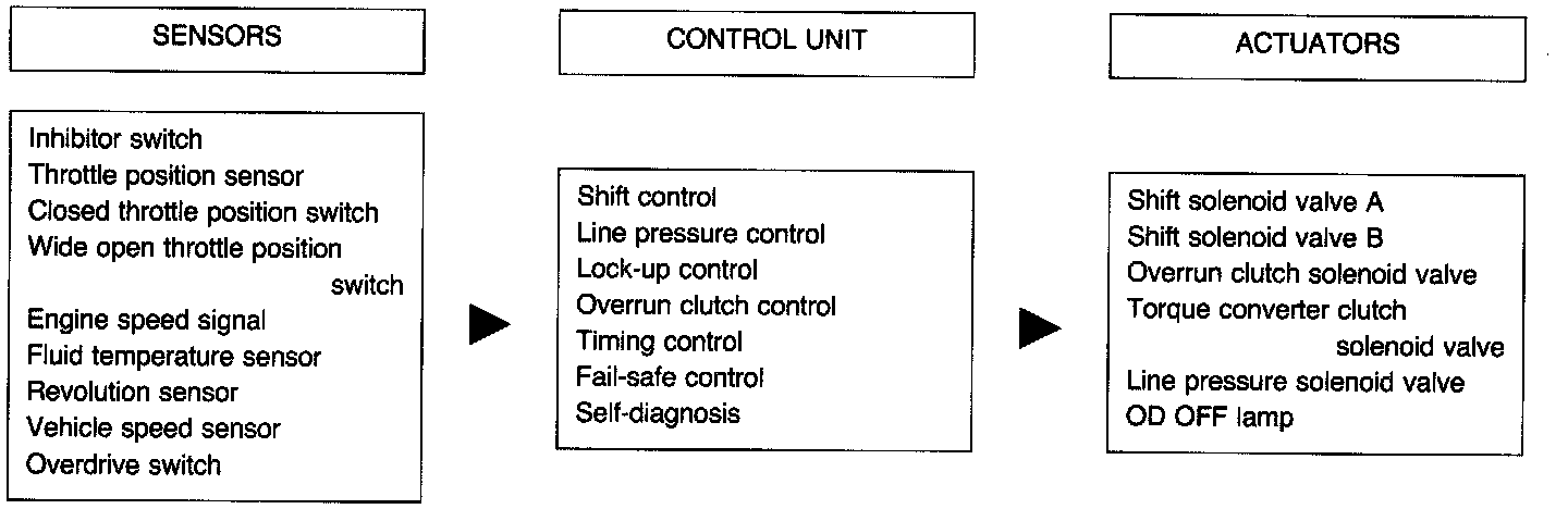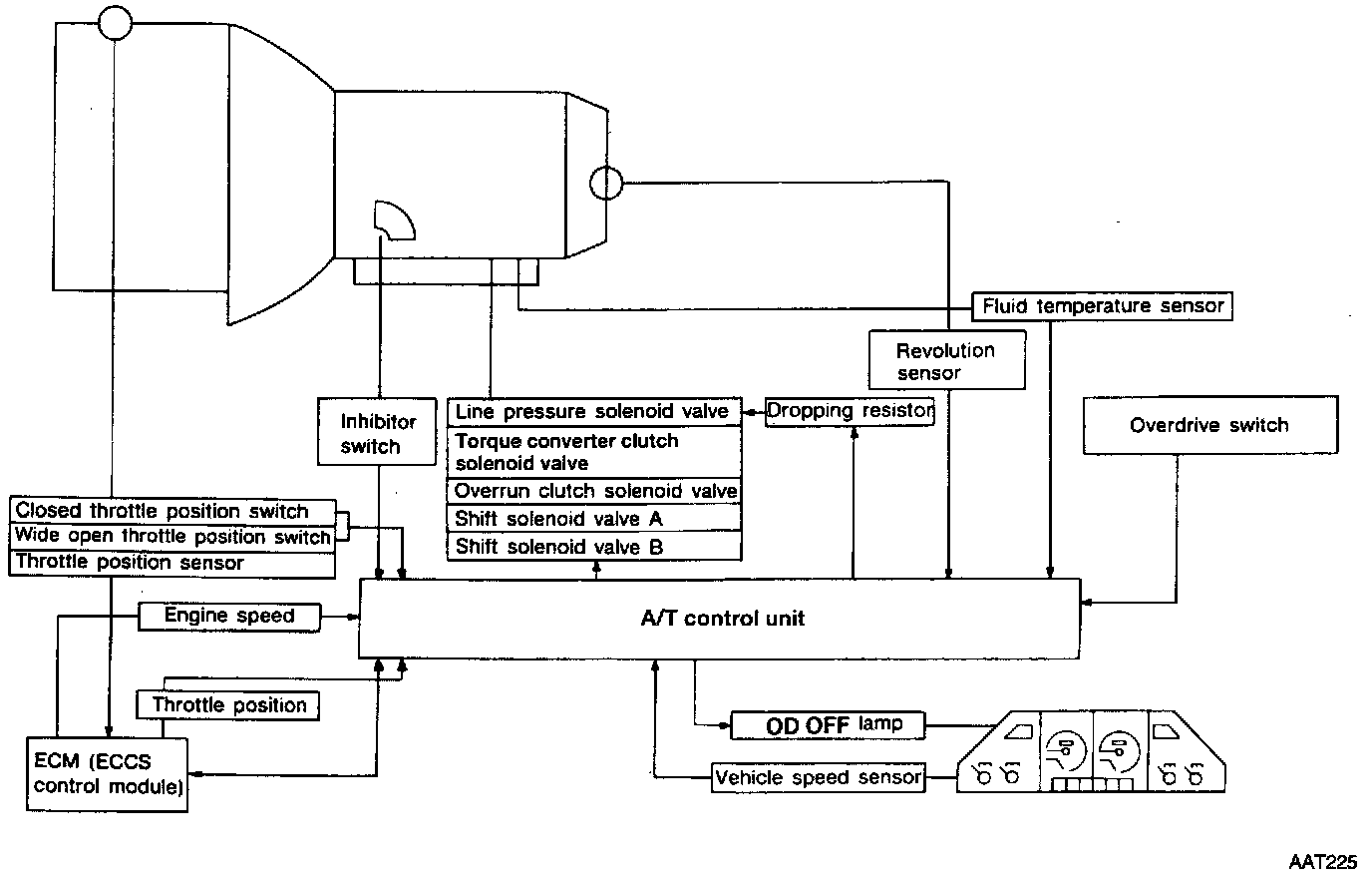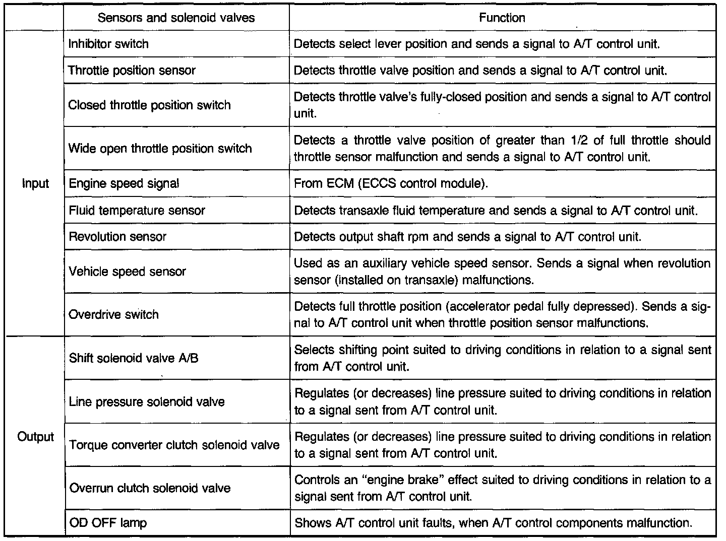 The a/T control unit receives signals sent from various switches and sensors, determines required line pressure, shifting point, lock-up operation, engine brake operation, and sends required signals to the respective solenoids.