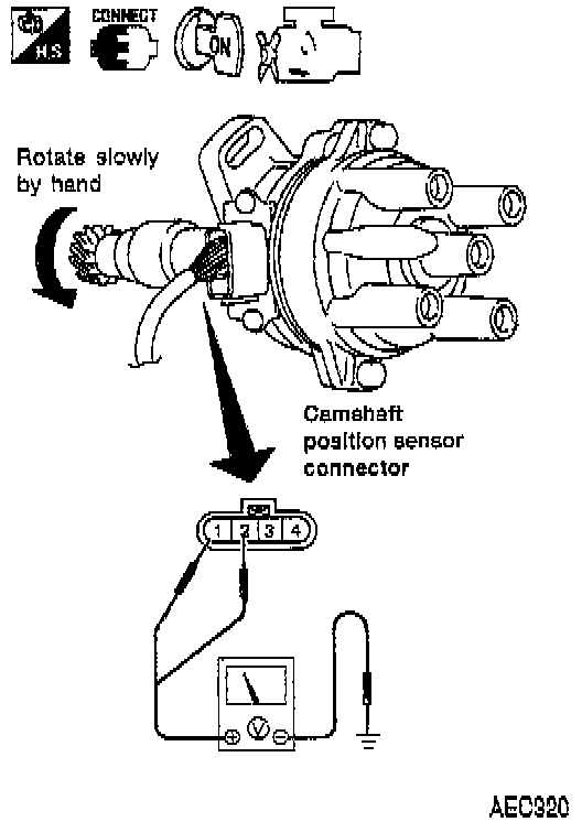 4. Rotate distributor shaft slowly by hand and check voltage between terminals 1, 2 and ground.