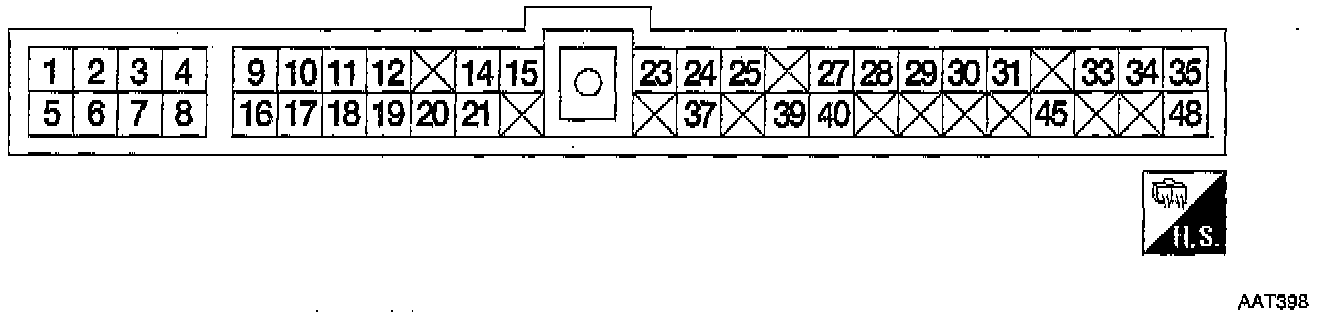 Measure voltage between each terminal and terminal (15) or (48) by following "A/T CONTROL UNIT INSPECTION TABLE".