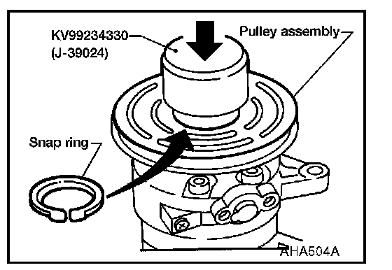 Install the pulley assembly using the installer and a hand press, and then install the snap ring using snap ring pliers.