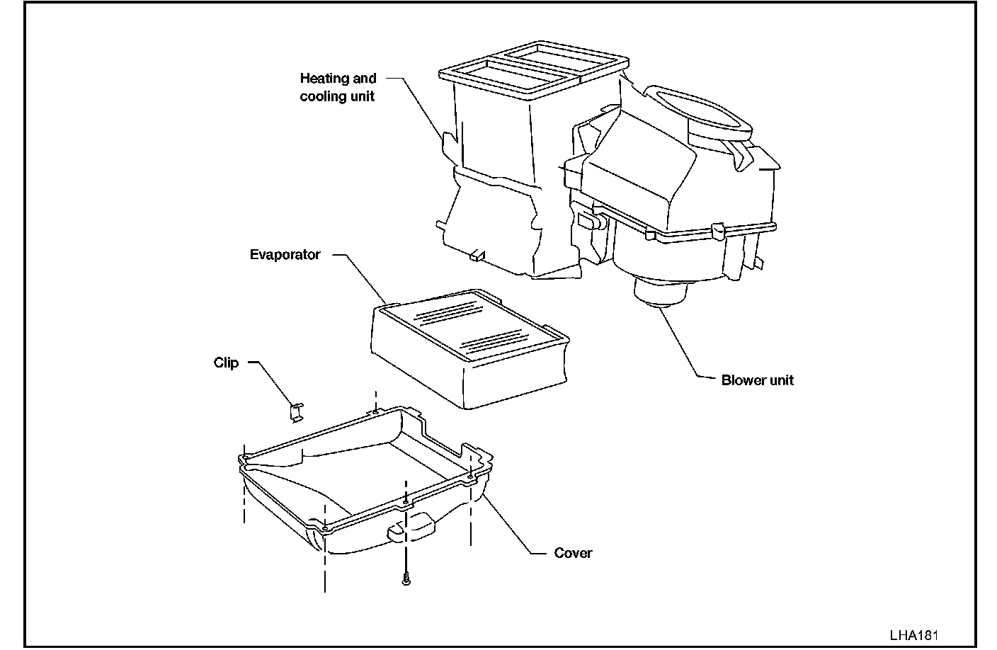 10. Remove five screws and clip from heating and cooling unit lower cover.