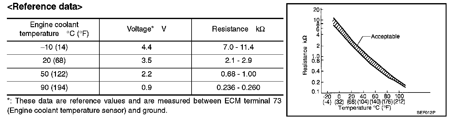 The engine coolant temperature sensor is used to detect the engine coolant temperature. The sensor modifies a voltage signal from the ECM. The modified signal returns to the ECM as the engine coolant temperature input. The sensor uses a thermistor which is sensitive to the change in temperature. The electrical resistance of the thermistor decreases as temperature increases.