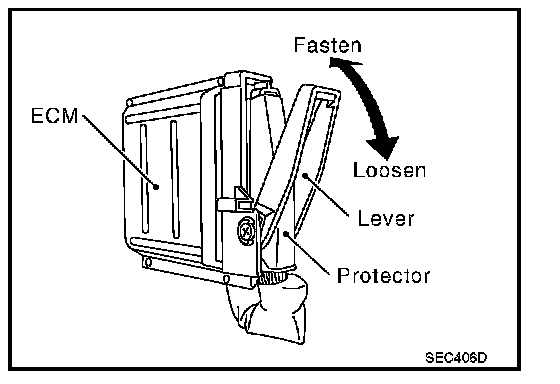 - When connecting ECM harness connector, fasten it securely with a lever as far as it will go as shown at right.