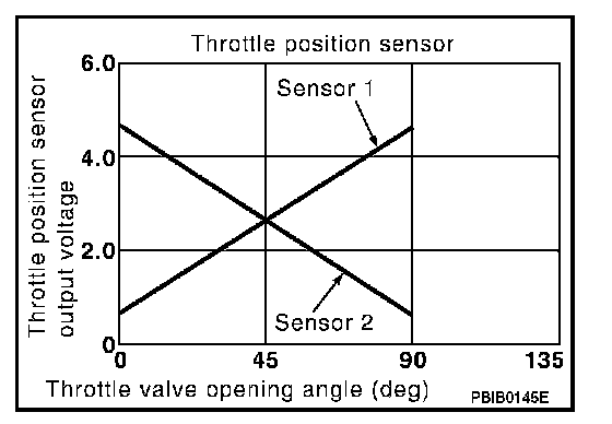 The throttle position sensor has the two sensors. These sensors are a kind of potentiometers which transform the throttle valve position into output voltage, and emit the voltage signal to the ECM. In addition, these sensors detect the opening and closing speed of the throttle valve and feed the voltage signals to the ECM. The ECM judges the current opening angle of the throttle valve from these signals and the ECM controls the throttle control motor to make the throttle valve opening angle properly in response to driving condition.