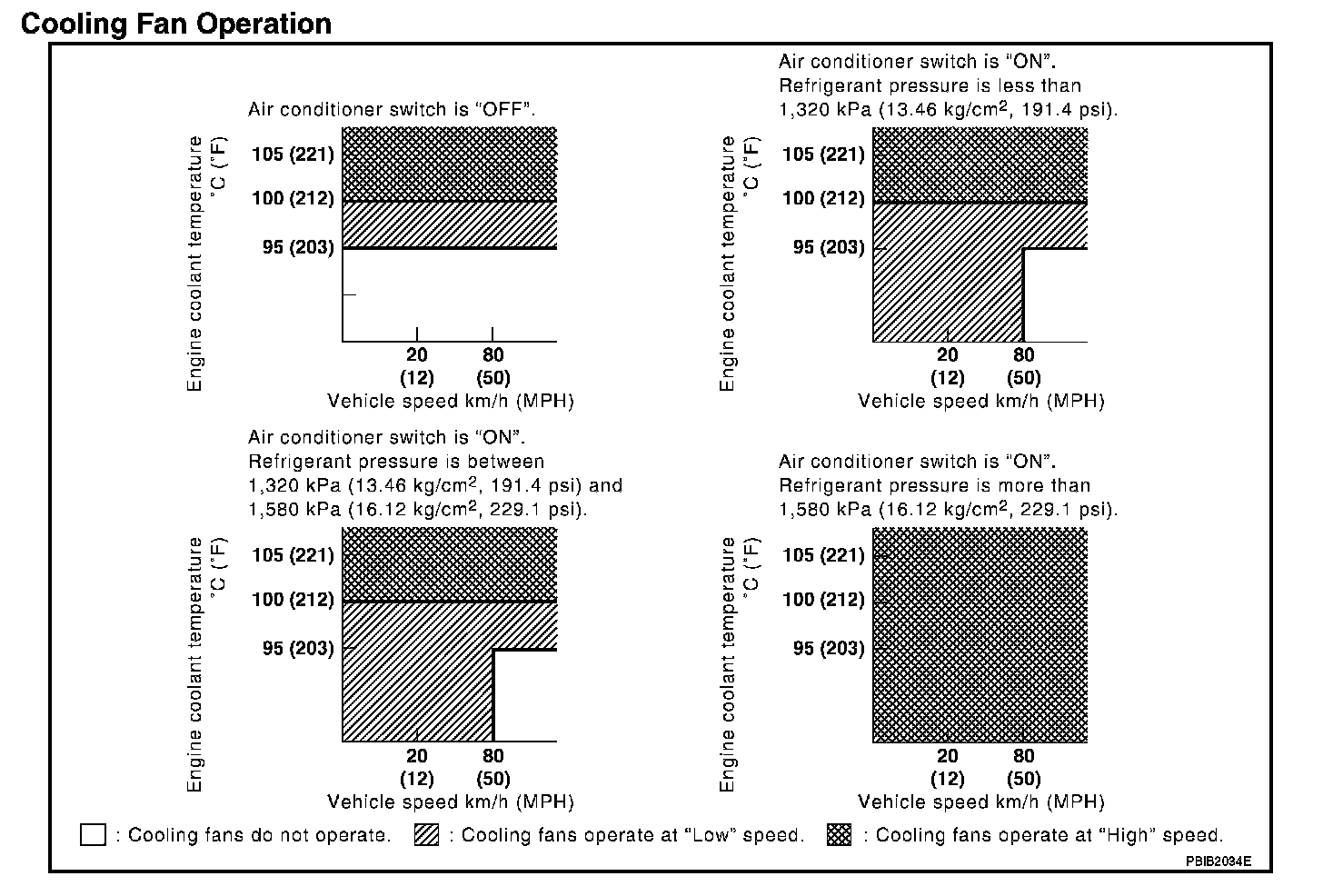 The ECM controls the cooling fan corresponding to the vehicle speed, engine coolant temperature, refrigerant pressure, and air conditioner ON signal. The control system has 3-step control [HIGH/LOW/OFF].