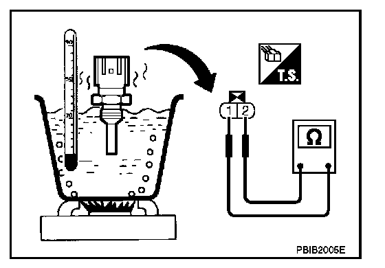 1. Check resistance between engine coolant temperature sensor terminals 1 and 2 as shown in the figure.