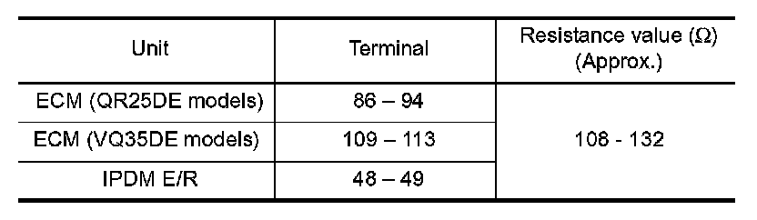 - Check resistance between ECM terminals 86 and 94 (QR25DE models).