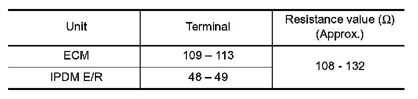 - Check resistance between IPDM E/R terminals 48 and 49.