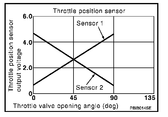 The throttle position sensor has the two sensors. These sensors are a kind of potentiometers which transform the throttle valve position into output voltage, and emit the voltage signal to the ECM. In addition, these sensors detect the opening and closing speed of the throttle valve and feed the voltage signals to the ECM. The ECM judges the current opening angle of the throttle valve from these signals and the ECM controls the throttle control motor to make the throttle valve opening angle properly in response to driving condition.