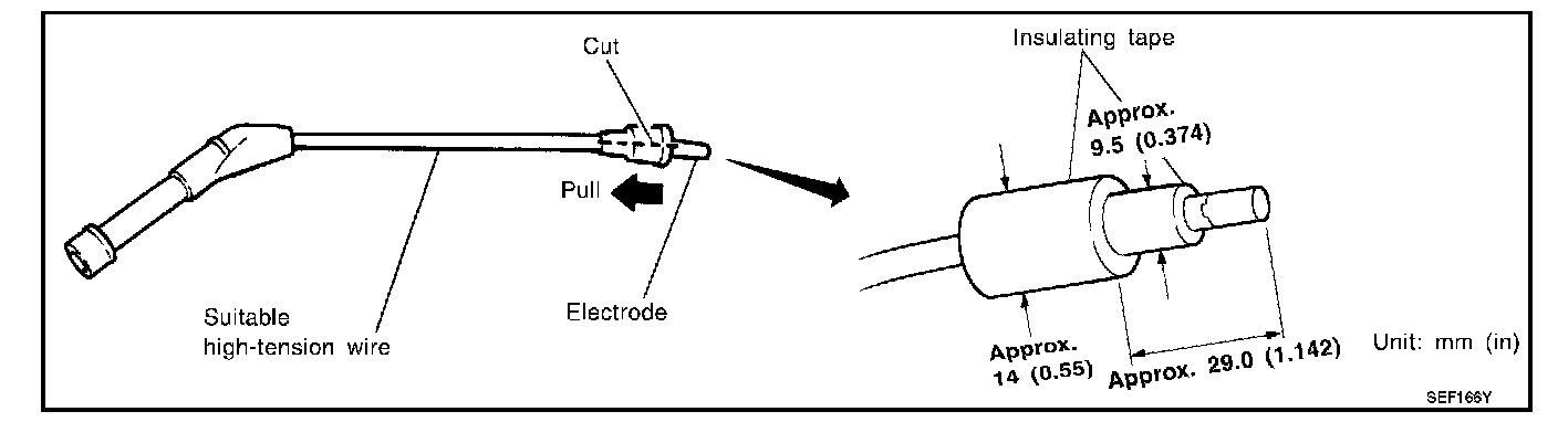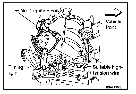 - Connect No. 1 ignition coil and No. 1 spark plug with suitable high-tension wire as shown, and attach timing light clamp to this wire.