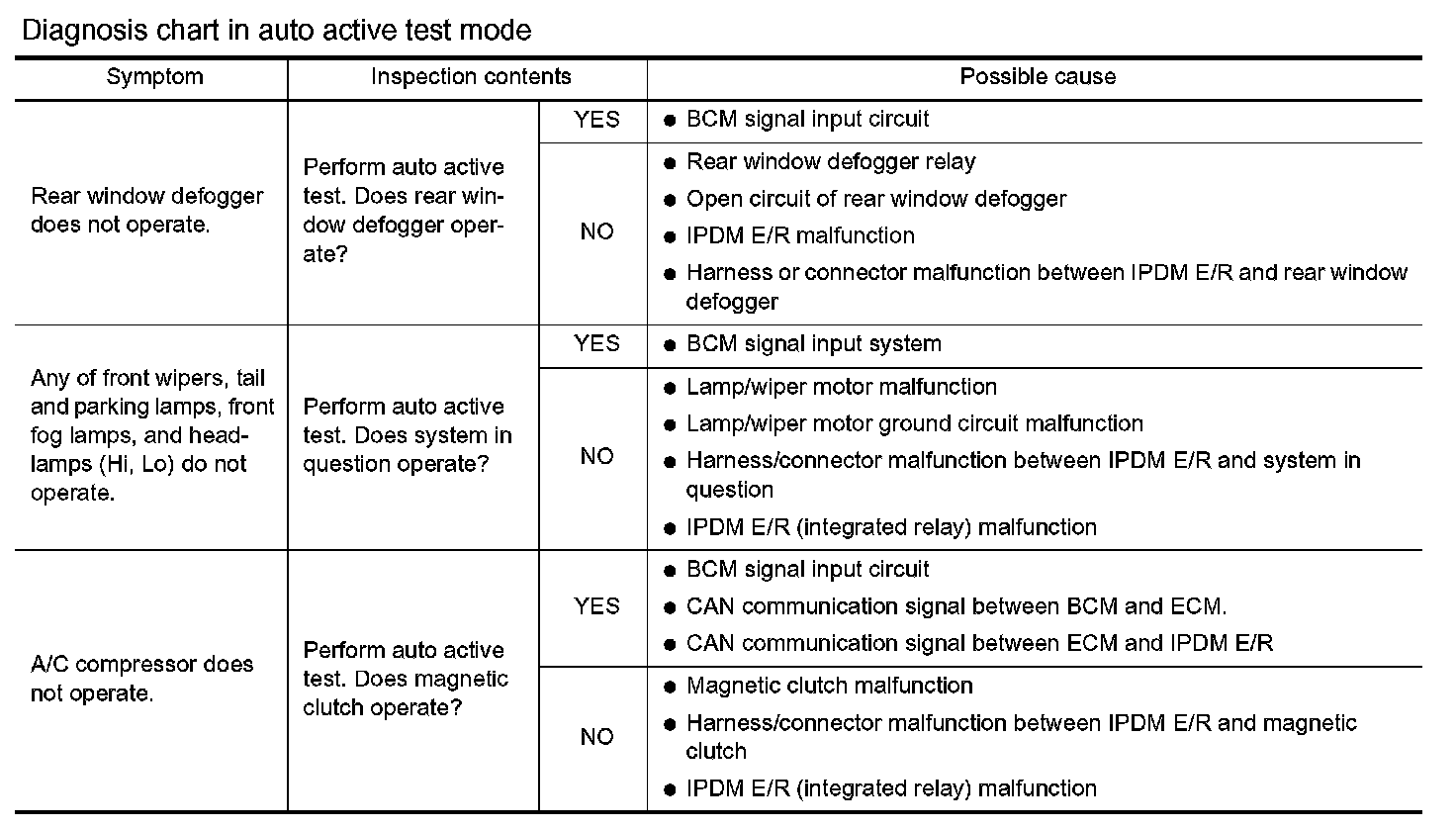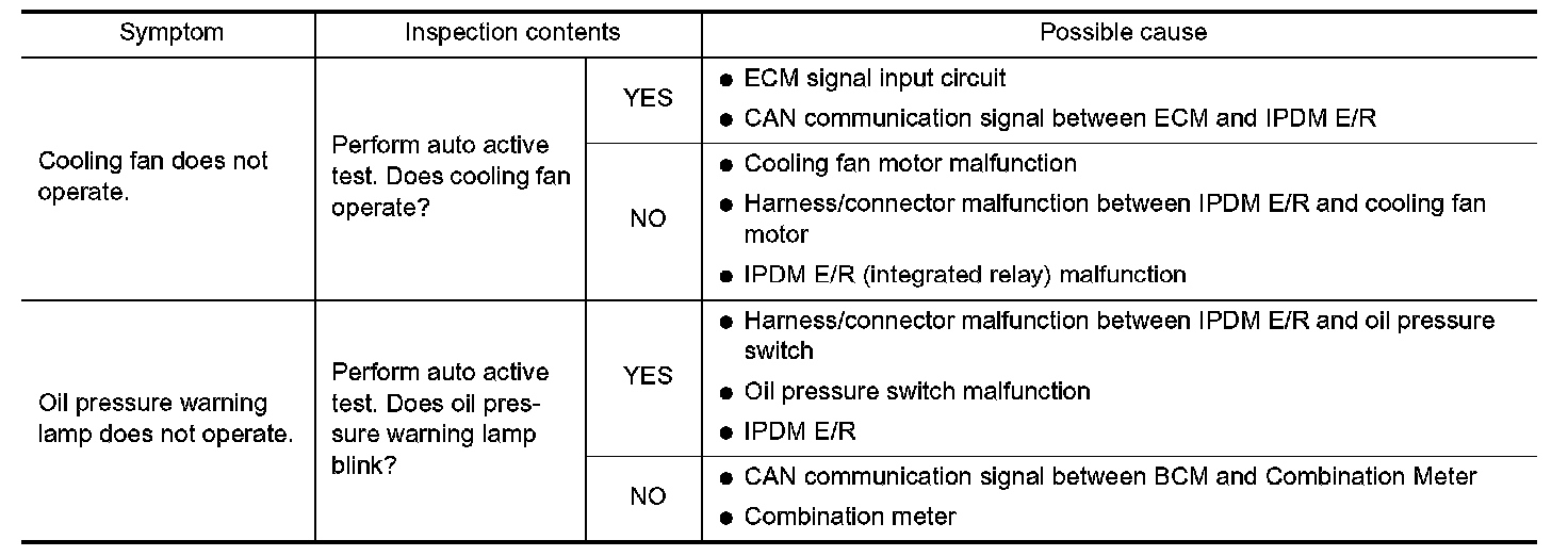 - If any of systems controlled by IPDM E/R cannot be operated, possible cause can be easily diagnosed using auto active test.