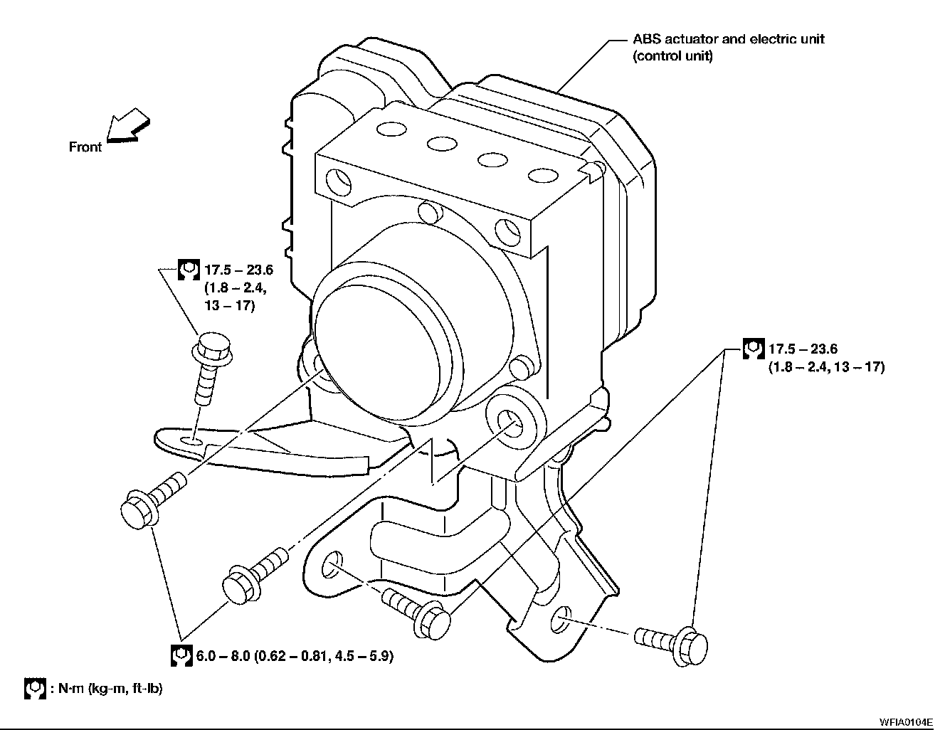 8. Remove fasteners for ABS actuator and electric unit (control unit) and remove from vehicle.