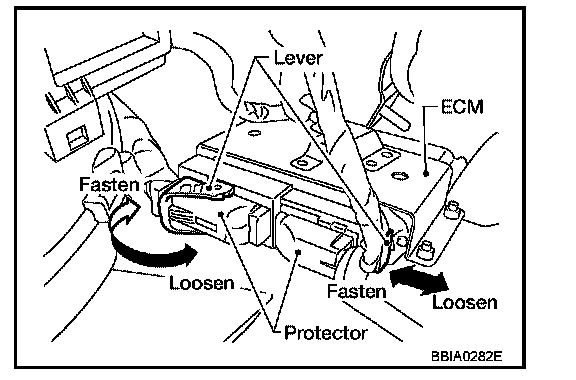 3. When disconnecting ECM harness connector, loosen it with levers as far as they will go as shown in the figure.