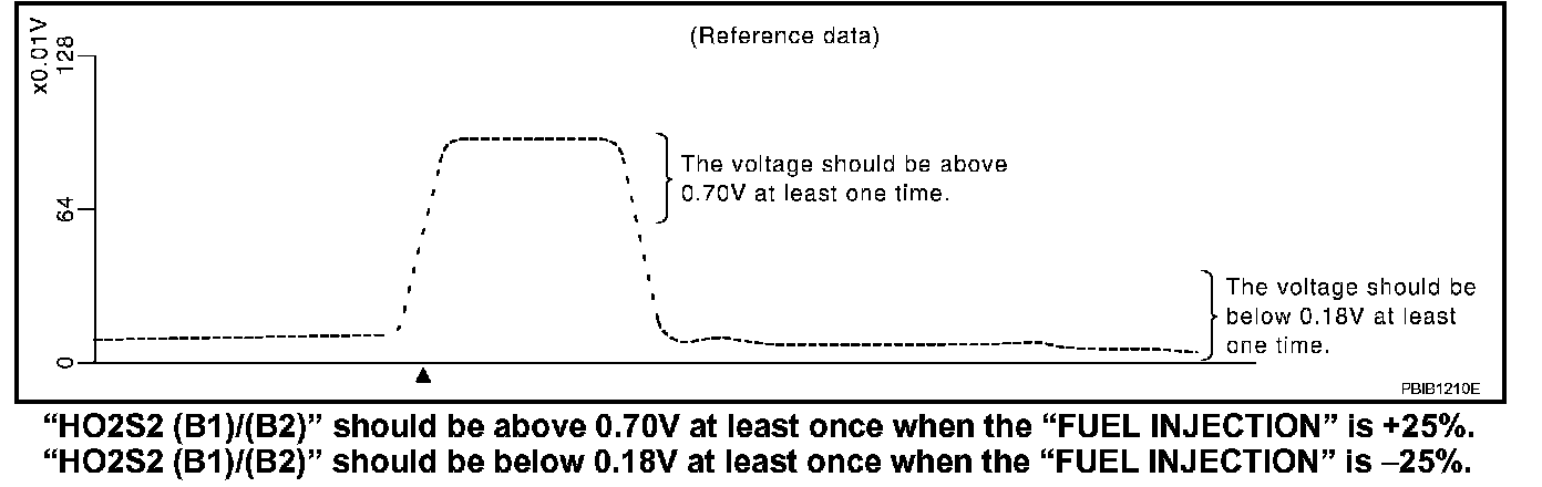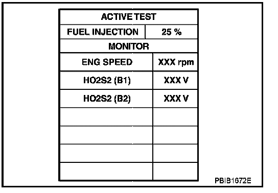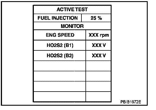 7. Check "HO2S2 (B1)/(B2)" at idle speed when adjusting "FUEL INJECTION" to ±25%.