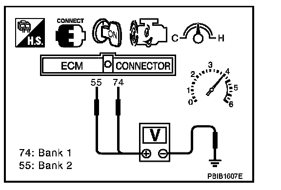 5. Set voltmeter probes between ECM terminal 74 [HO2S2 (B1) signal] or 55 [HO2S2 (B2) signal] and engine ground.