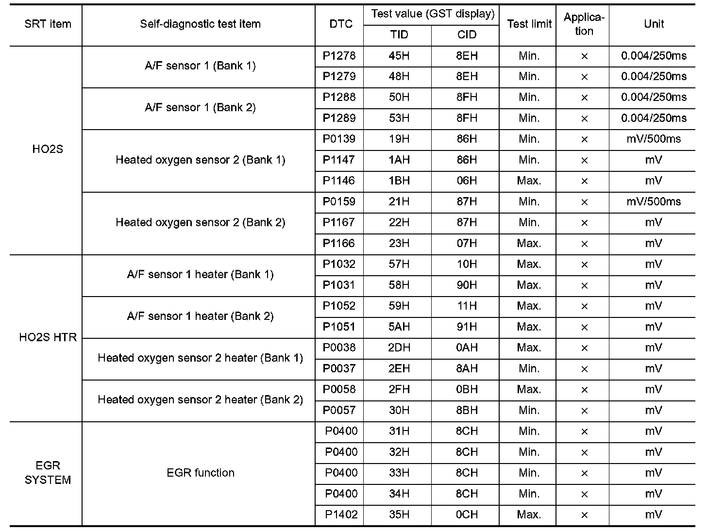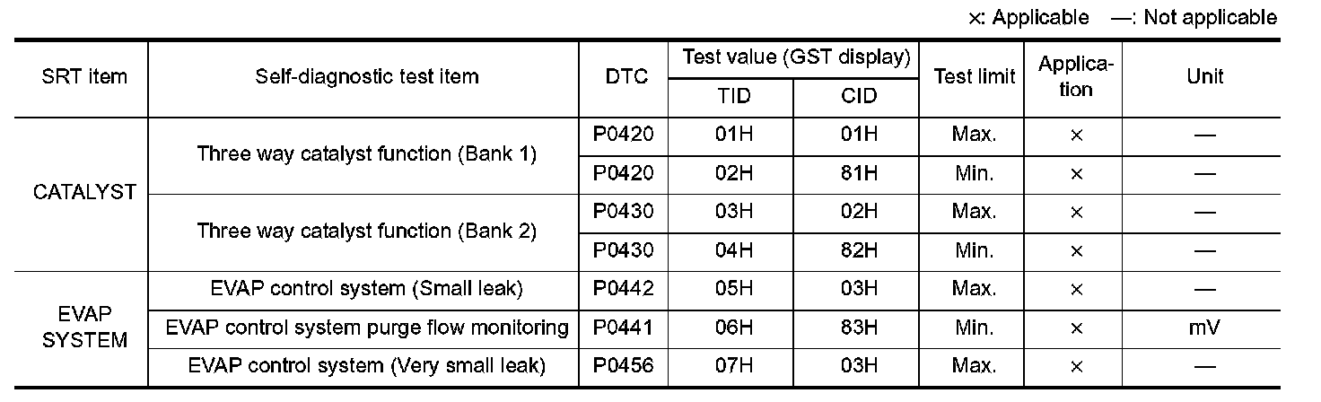 TEST VALUE AND TEST LIMIT (GST ONLY - NOT APPLICABLE TO CONSULT-II)The following is the information specified in Mode 6 of SAE J1979.