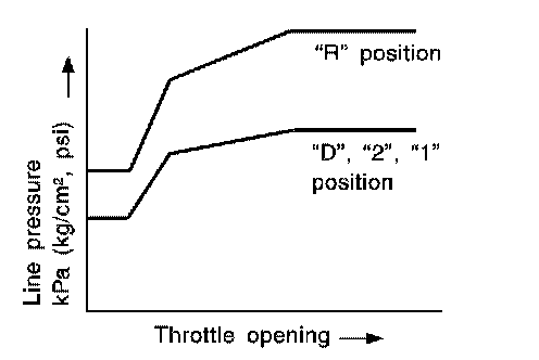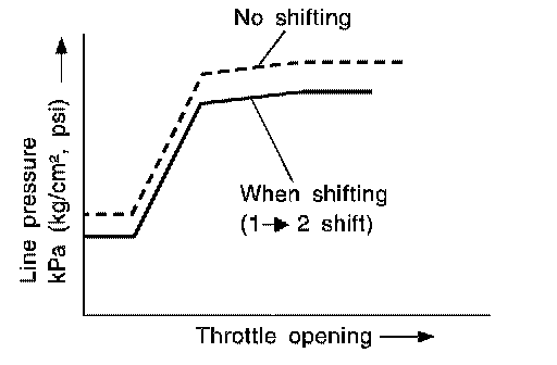 ^ Line pressure is increased to a maximum irrespective of the throttle opening when fluid temperature drops to -10°C (14°F). This pressure rise is adopted to prevent a delay in clutch and brake operation due to extreme drop of fluid viscosity at low temperature.