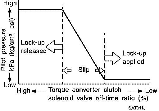 The torque converter clutch solenoid valve is controlled by the TCM. The plunger closes the drain circuit during the OFF period, and opens the circuit during the ON period. If the percentage of OFF-time increases in one cycle, the pilot pressure drain time is reduced and pilot pressure remains high.