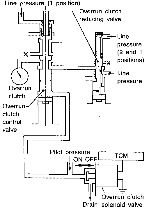 During the solenoid valve ON pilot pressure is applied to the end face of the overrun clutch control valve.