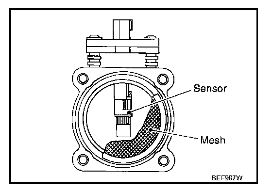 The mass air flow sensor is placed in the stream of intake air. It measures the intake flow rate by measuring a part of the entire intake flow. It consists of a hot film that is supplied with electric current from the ECM. The temperature of the hot film is controlled by the ECM a certain amount. The heat generated by the hot film is reduced as the intake air flows around it. The more air, the greater the heat loss. Therefore, the ECM must supply more electric current to maintain the temperature of the hot film as air flow increases. The ECM detects the air flow by means of this current change.