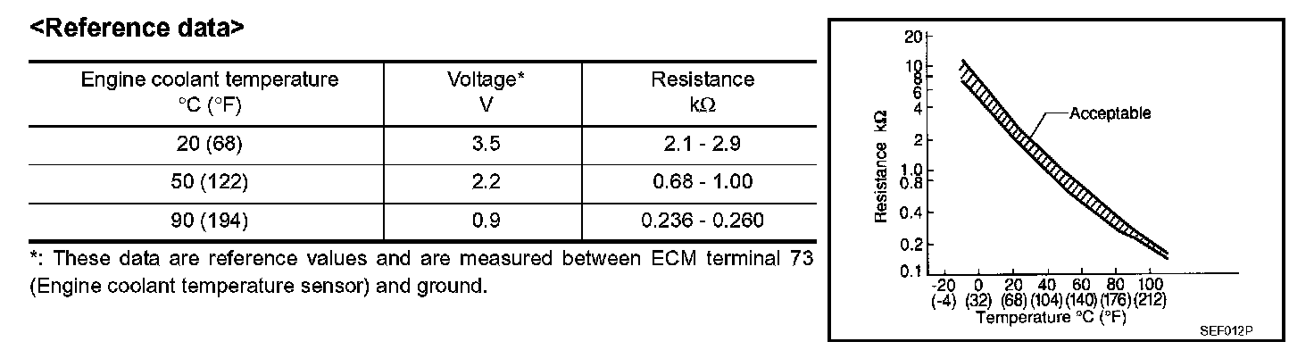 The engine coolant temperature sensor is used to detect the engine coolant temperature. The sensor modifies a voltage signal from the ECM. The modified signal returns to the ECM as the engine coolant temperature input. The sensor uses a thermistor which is sensitive to the change in temperature. The electrical resistance of the thermistor decreases as temperature increases.