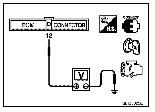 Check voltage between ECM terminal 12 and ground under the given conditions.