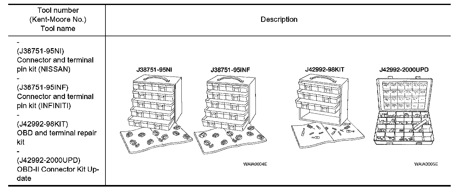 The connector and terminal pin kits contain some of the most commonly used NISSAN/INFINITI connectors and terminals. For detailed connector and terminal pin replacement procedures, refer to the latest NISSAN/ INFINITI CONNECTOR AND TERMINAL PIN SERVICE MANUAL.