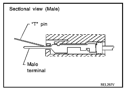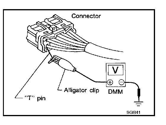 The probe of a digital multimeter (DMM) may not correctly fit the connector cavity. To correctly probe the connector, follow the procedures below using a "T" pin. For the best contact grasp the "T" pin using an alligator clip.