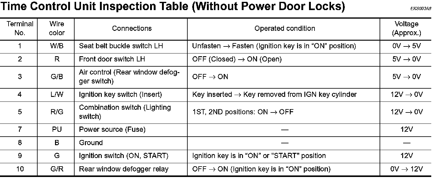 Time Control Unit Inspection Table (Without Power Door Locks):