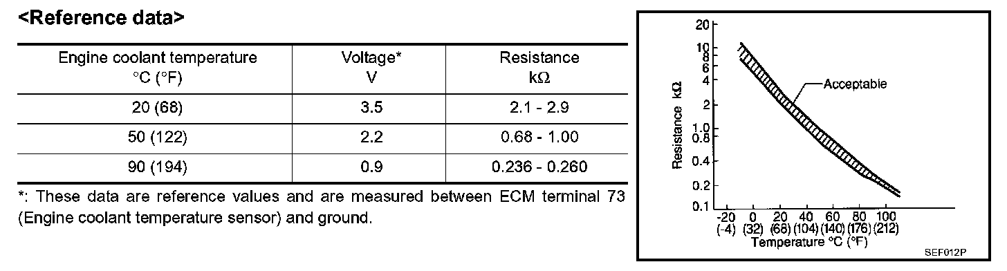 The engine coolant temperature sensor is used to detect the engine coolant temperature. The sensor modifies a voltage signal from the ECM. The modified signal returns to the ECM as the engine coolant temperature input. The sensor uses a thermistor which is sensitive to the change in temperature. The electrical resistance of the thermistor decreases as temperature increases.