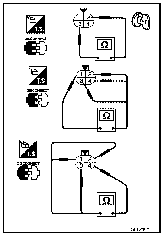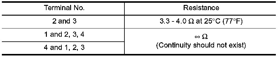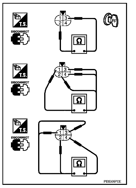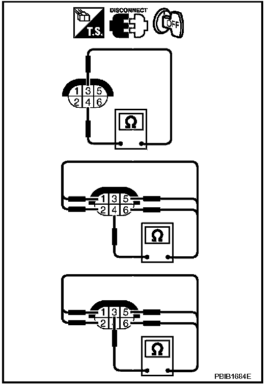 Check continuity between terminals 3 and 1, 2, 5, 6, terminals 4 and 1, 2, 5, 6.