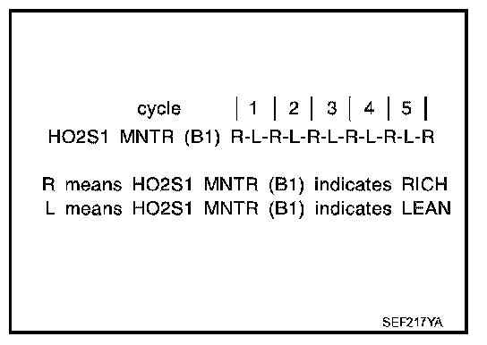 - "HO2S1 MNTR (B1)" in "DATA MONITOR" mode changes from "RICH" to "LEAN" to "RICH" more than 5 times in 10 seconds.