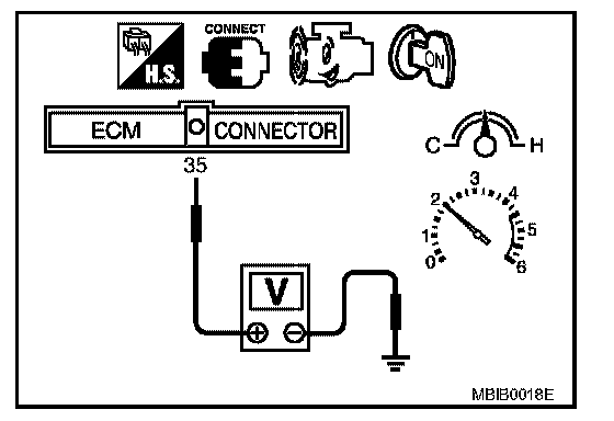 2. Set voltmeter probes between ECM terminal 35 [HO2S1 (B1) signal] and engine ground.