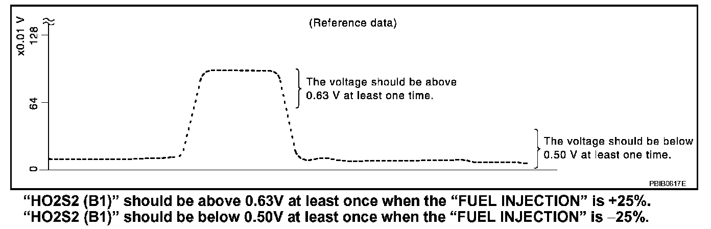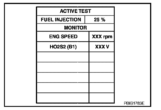 6. Check "HO2S2 (B1)" at idle speed when adjusting "FUEL INJECTION" to ±25%.