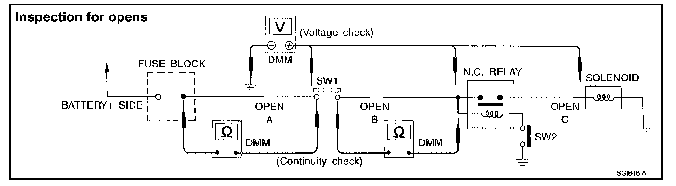 - Connect the probes between the relay and the solenoid. Little or no resistance will indicate that portion of the circuit has good continuity. If there were an open in the circuit, the DMM would indicate an over limit or infinite resistance condition. (point C) Any circuit can be diagnosed using the approach in the previous example.
