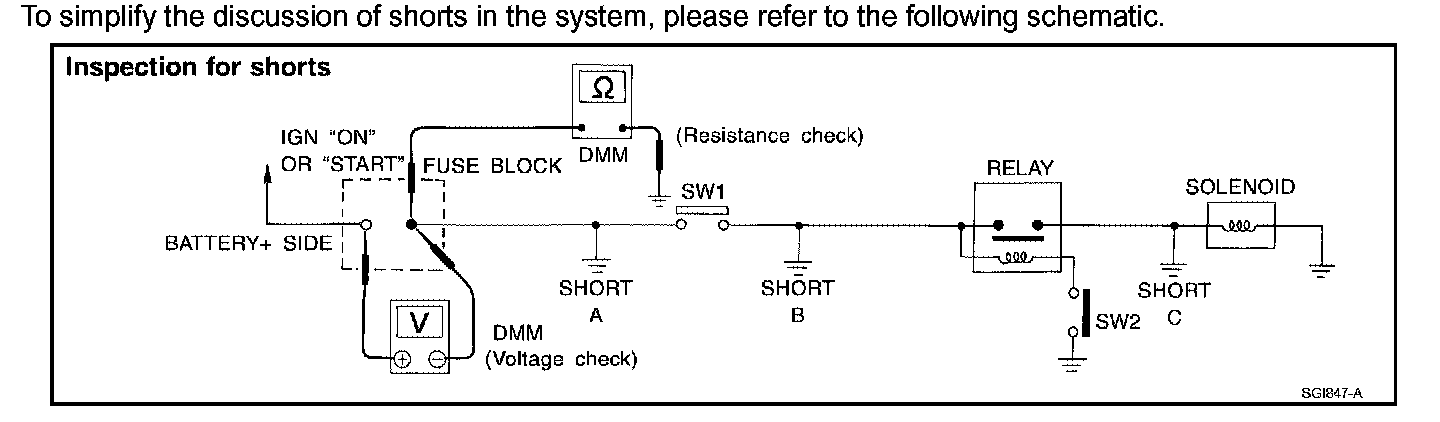 - With SW1 closed, relay and solenoid disconnected and the DMM leads across both fuse terminals, check for voltage. voltage; short is between SW1 and the relay (point B). no voltage; short is further down the circuit than the relay.