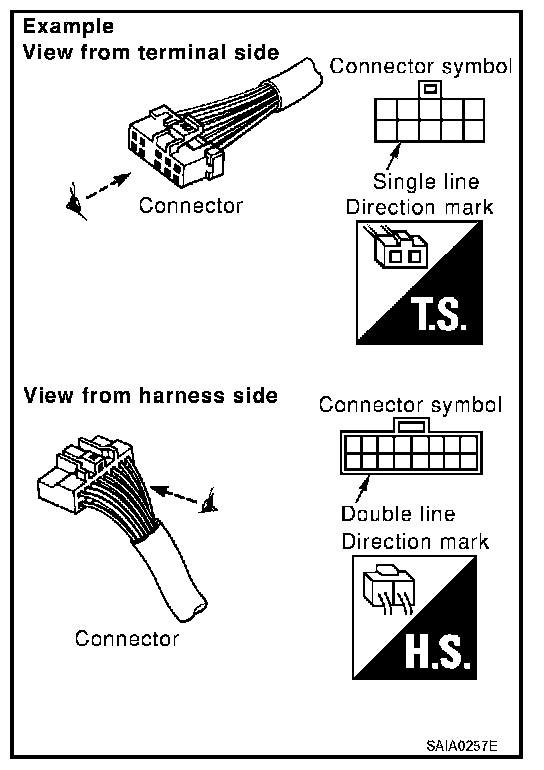 - Connector symbols shown from the harness side are enclosed by a double line and followed by the direction mark.
