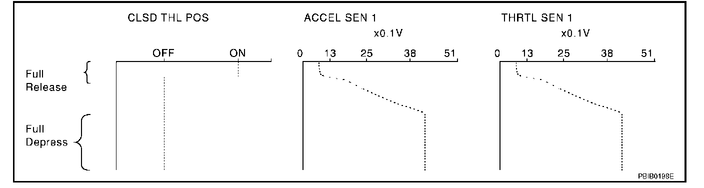 The signal of "ACCEL SEN 1" and "THRTL SEN 1" should rise gradually without any intermittent drop or rise after "CLSD THL POS" is changed from ON to OFF.