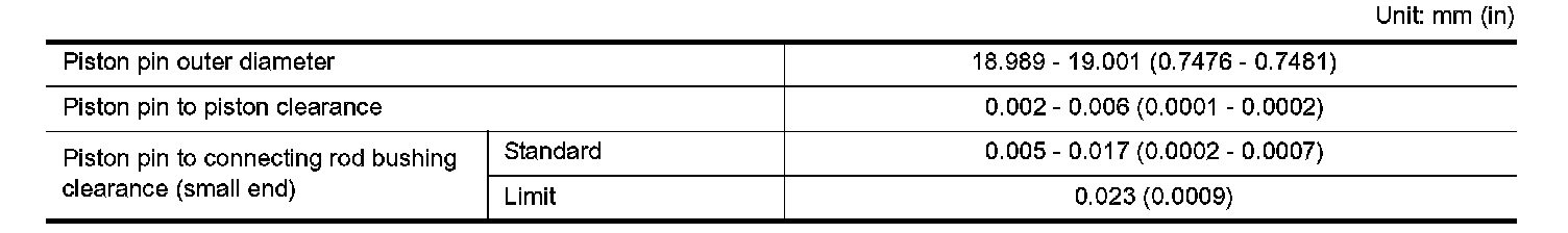 Piston pin to piston clearance: 0.002 - 0.006 mm (0.0001 - 0.0002 inch)