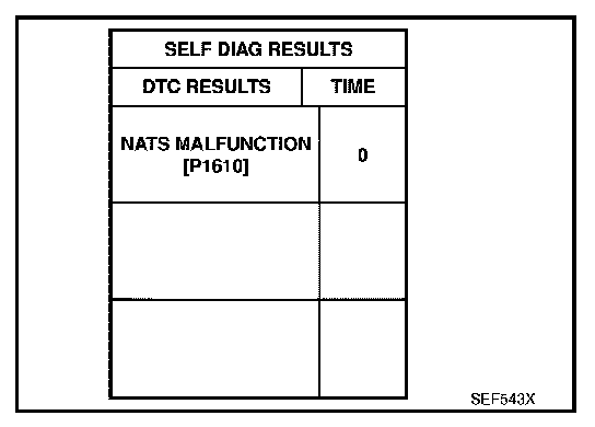 - If the security indicator lights up with the ignition switch in the ON position or "NATS MALFUNCTION" is displayed on "SELF-DIAG RESULTS" screen, perform self-diagnostic results mode with CONSULT-II using NATS program card. Refer to BL-96, "NVIS (NISSAN VEHICLE IMMOBILIZER SYSTEM - NATS)". NVIS (Nissan Vehicle Immobilizer System - NATS)