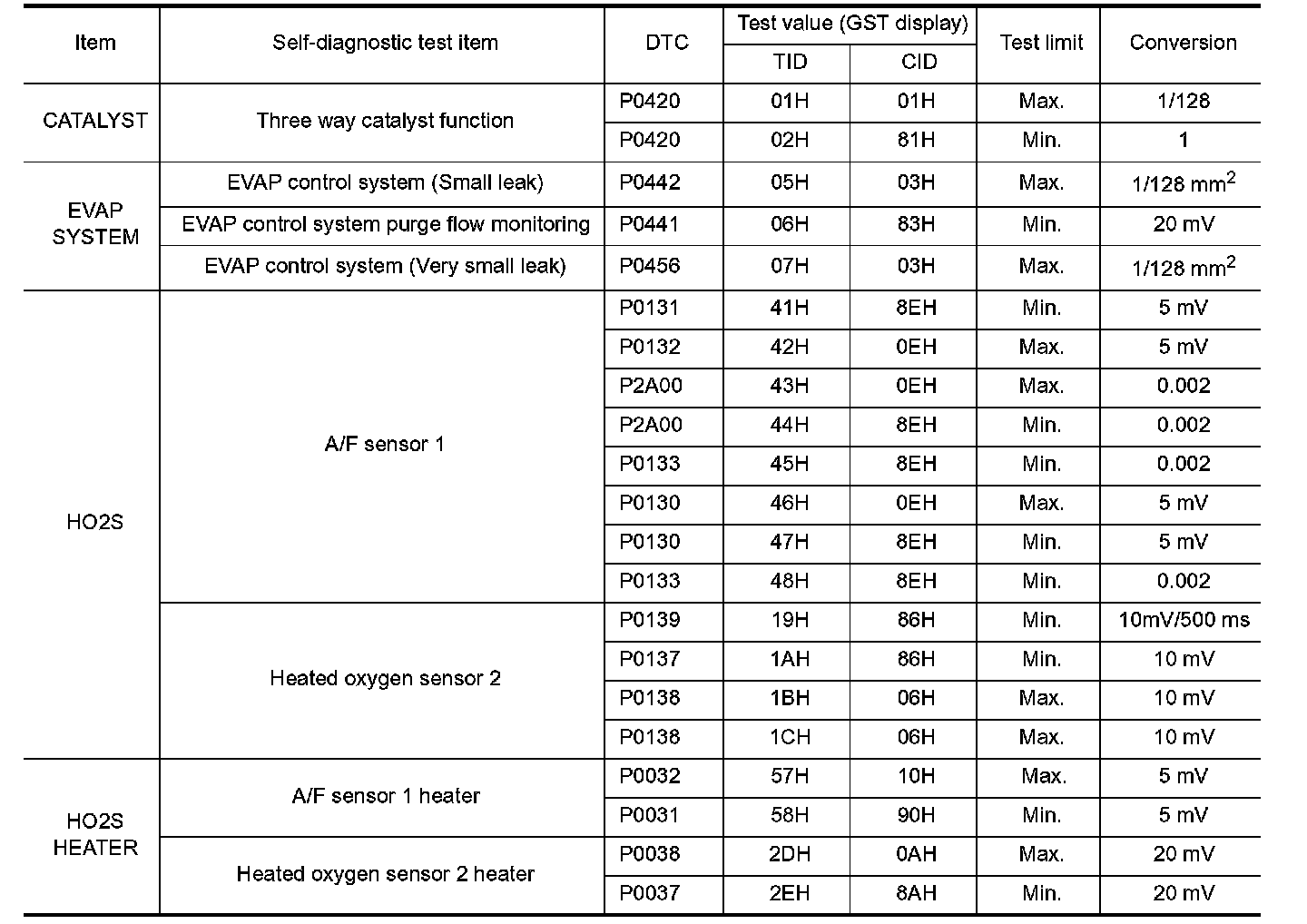 TEST VALUE AND TEST LIMIT (GST ONLY - NOT APPLICABLE TO CONSULT-II)The following is the information specified in Service $06 of SAE J1979.