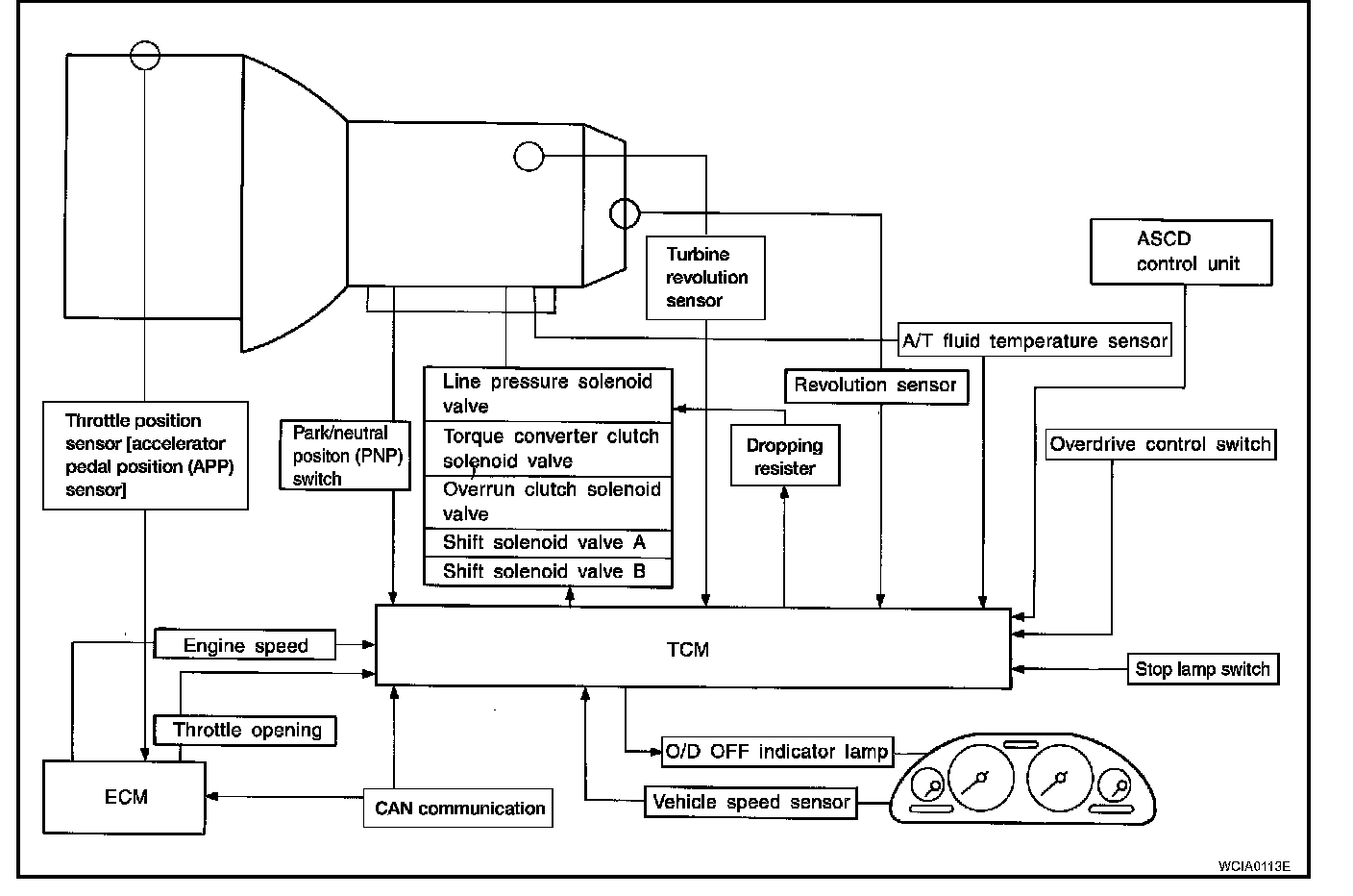 The automatic transaxle senses vehicle operating conditions through various sensors. It always controls the optimum shift position and reduces shifting and lock-up shocks.