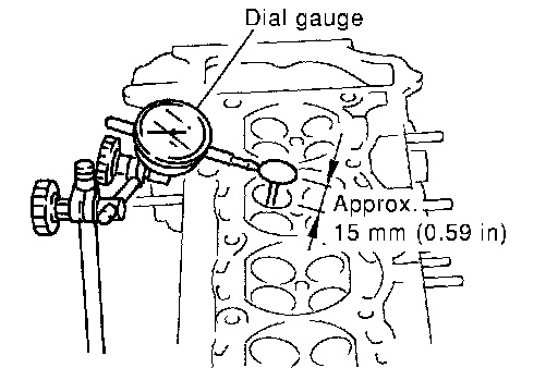 2. Push the valve out by approximately 15 mm (0.59 inch) toward the combustion chamber side to measure the valve's run-out volume (in the direction of dial gauge) with dial gauge.