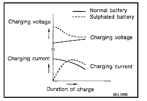 To determine if a battery has been "sulphated", note its voltage and current when charging it. As shown in the figure, less current and higher voltage are observed in the initial stage of charging sulphated batteries.