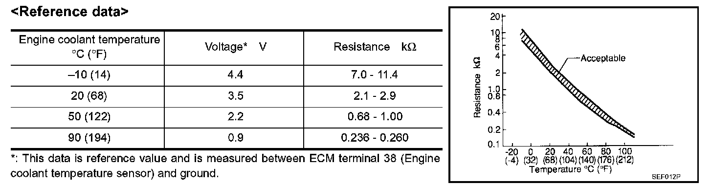 The engine coolant temperature sensor is used to detect the engine coolant temperature. The sensor modifies a voltage signal from the ECM. The modified signal returns to the ECM as the engine coolant temperature input. The sensor uses a thermistor which is sensitive to the change in temperature. The electrical resistance of the thermistor decreases as temperature increases.
